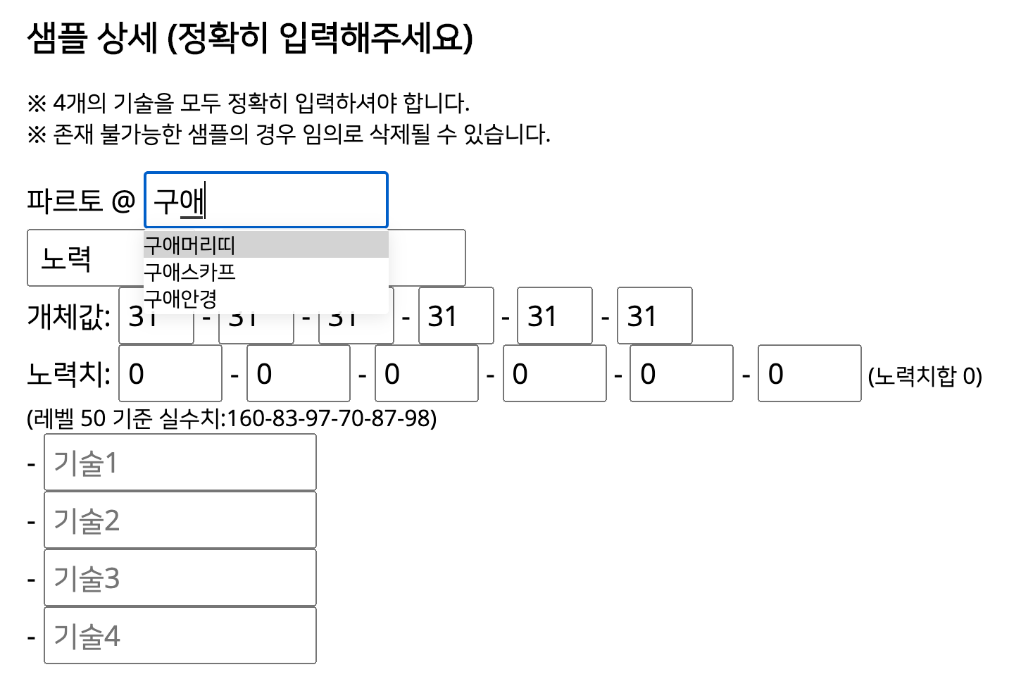 자동완성의 도움을 받아 도구, 성격, 특성, 개체값, 노력치, 기술 4개를 모두 정확히 입력합니다.