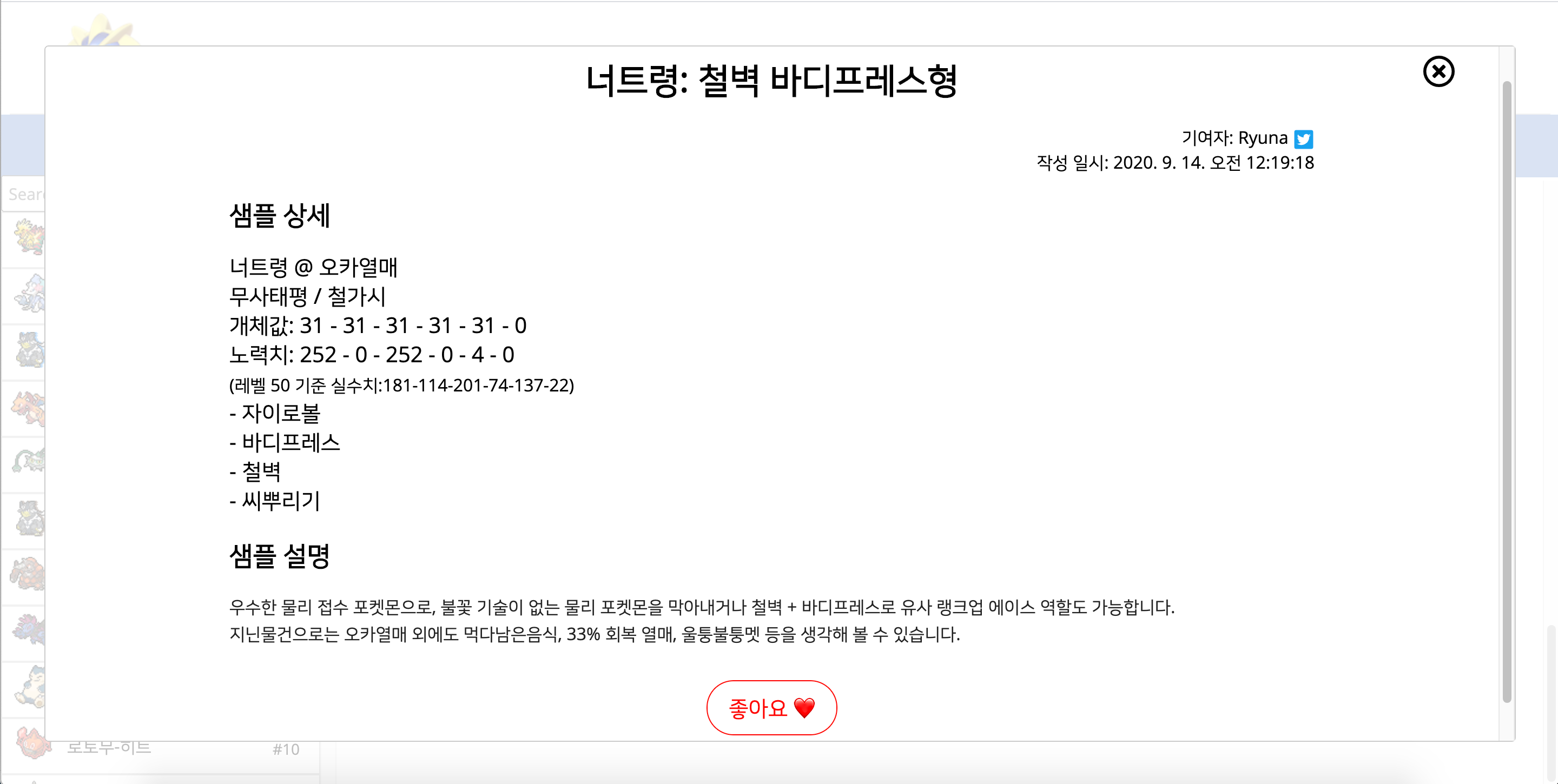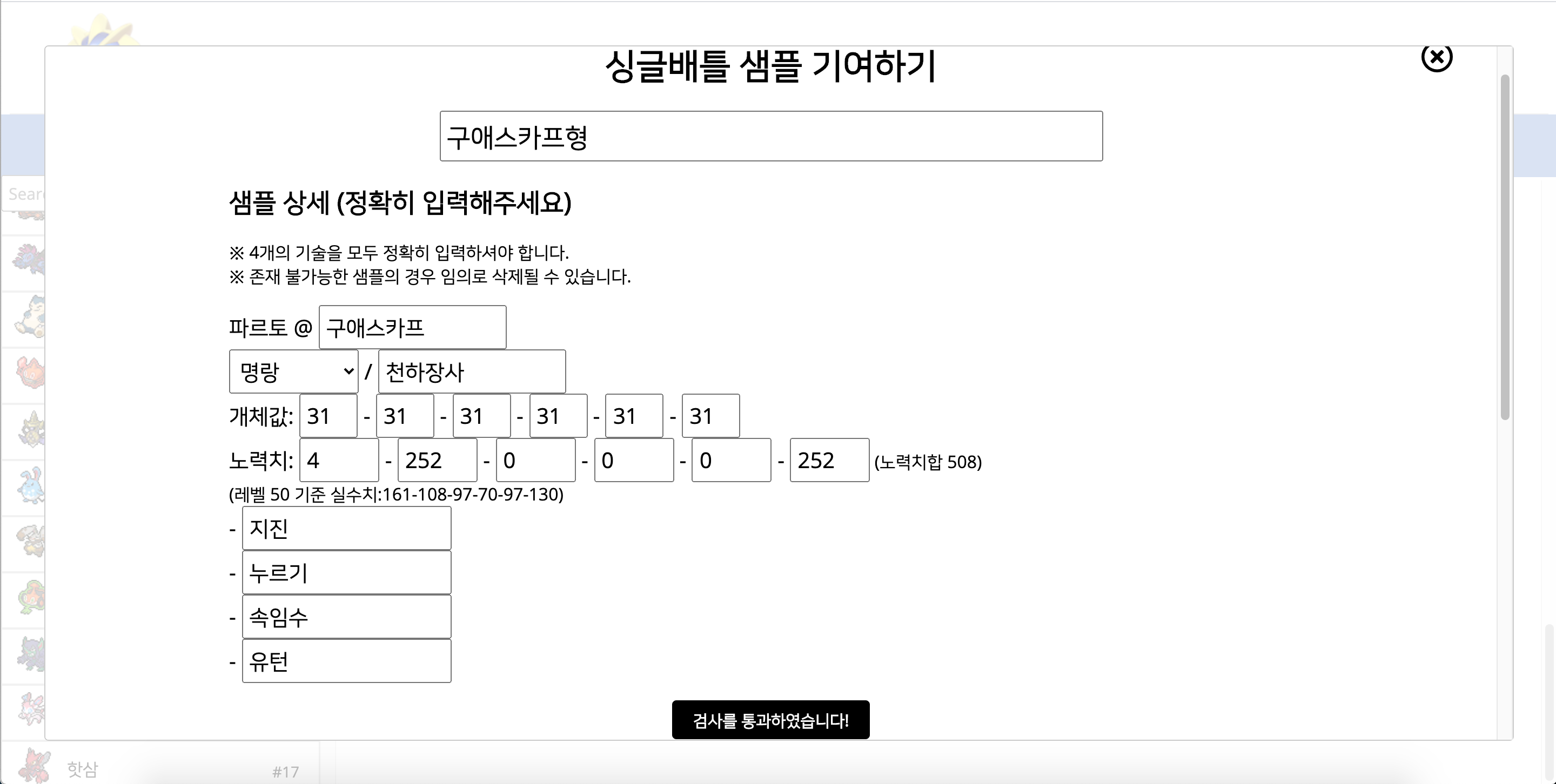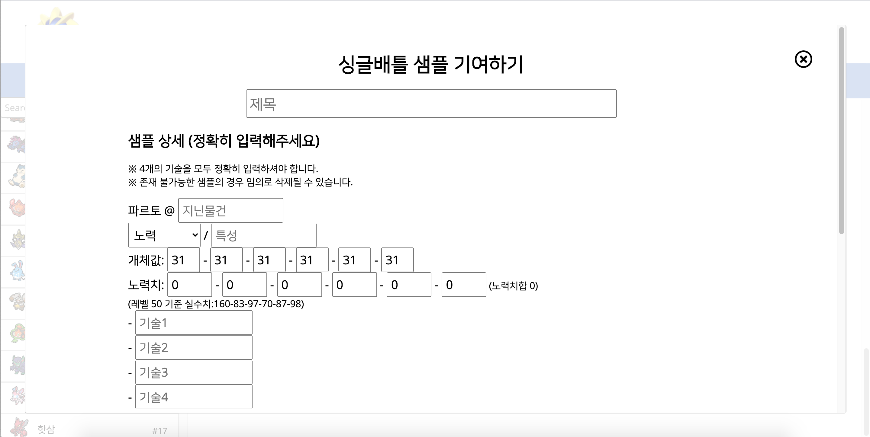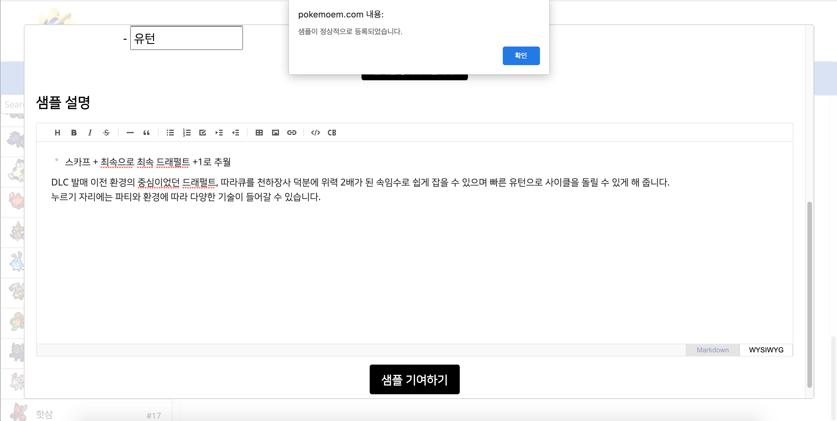 샘플 도감은 유저들이 직접 자신의 포켓몬 샘플(풀세팅)을 공유하고, 이용자 모두가 열람해 볼 수 있게 하는 기능입니다.