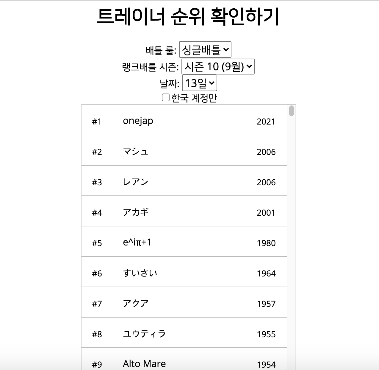 <9월 13일의 싱글배틀 트레이너 순위를 확인하는 화면>