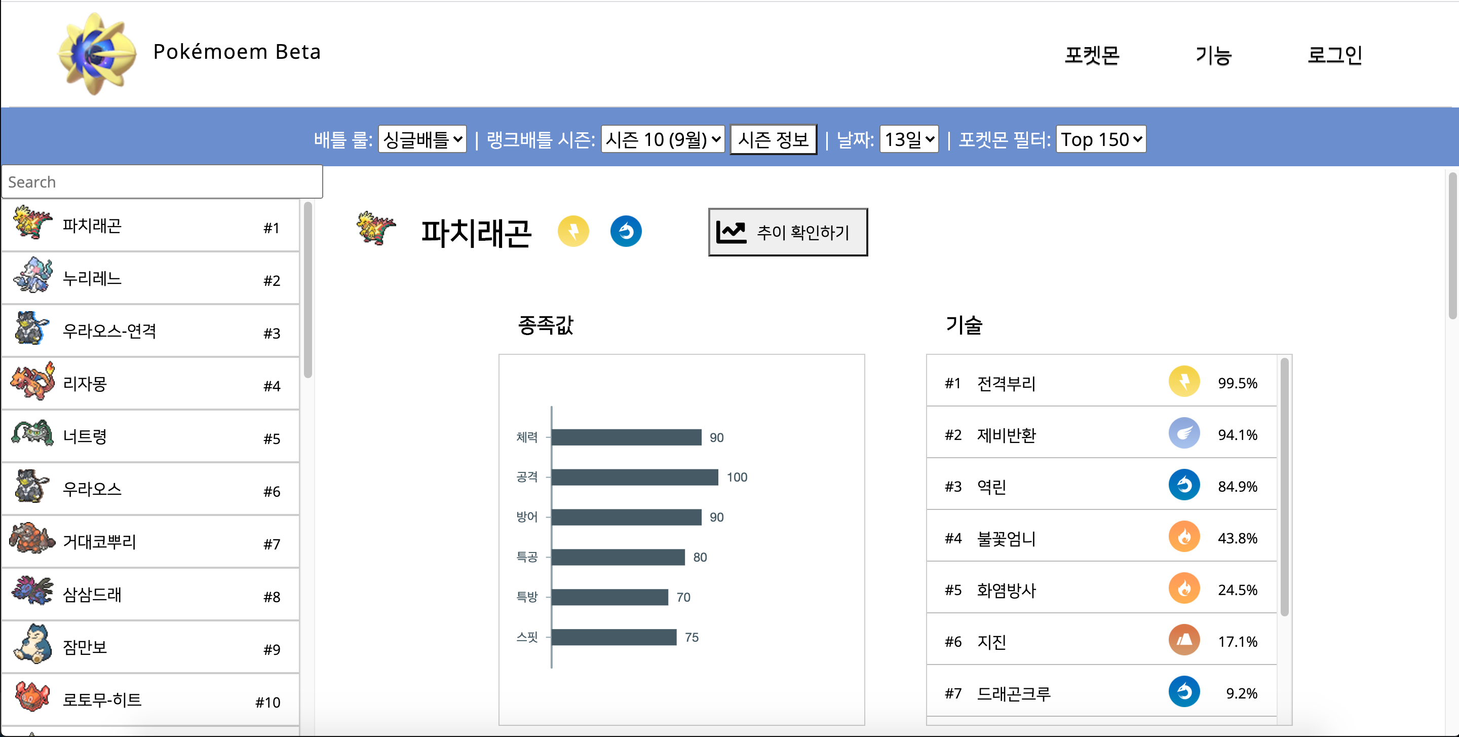 현재 Pokémoem에서 제공하는 유일한 메인 기능이며, 유저분들이 포켓몬 홈 배틀 데이터를 언제 어디서나 쉽게 열람하고 분석할 수 있는 툴을 제공합니다.
