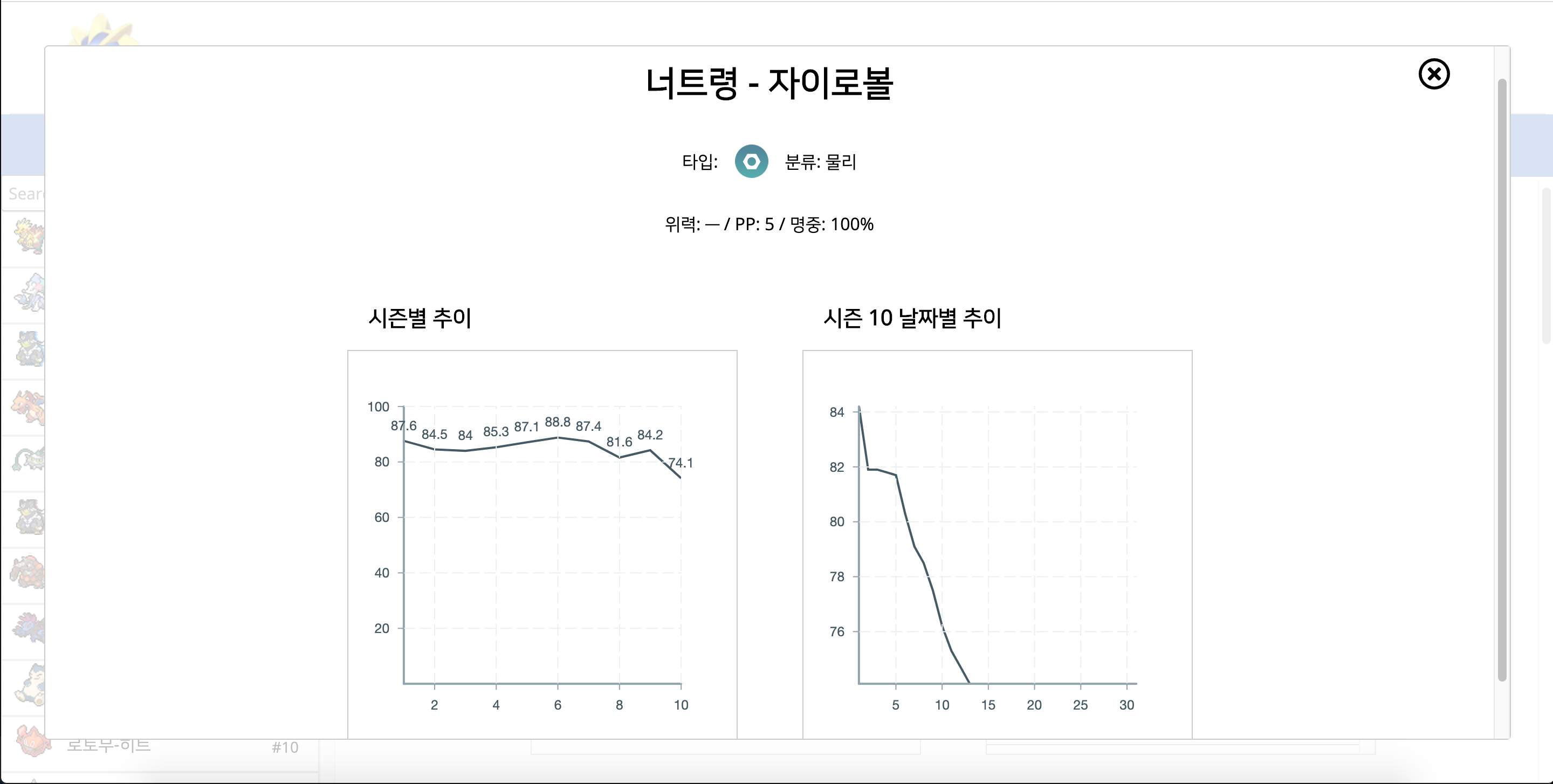 포켓몬 홈 배틀 데이터 란에서 확인할 수 있는 포켓몬 순위나 기술, 도구, 특성, 성격 빈도 값의 시즌별/날짜별 추이를 꺾은선그래프로 그려 주는 기능을 갖추고 있습니다.
