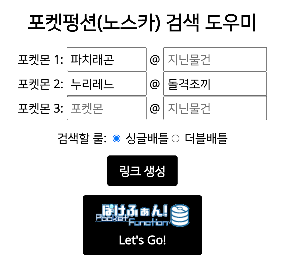 포켓펑션 검색 도우미는 포켓펑션 검색을 한국어로도 쉽게 할 수 있도록 개발한 툴입니다. 일본어를 모르는 유저의 경우 포켓펑션에 원하는 포켓몬을 검색하려면 타 사이트에서 포켓몬의 일칭을 일일히 검색해야 했는데, 이 툴은 그러한 과정에 걸리는 시간을 크게 단축해 주기 때문에 유용할 것입니다.