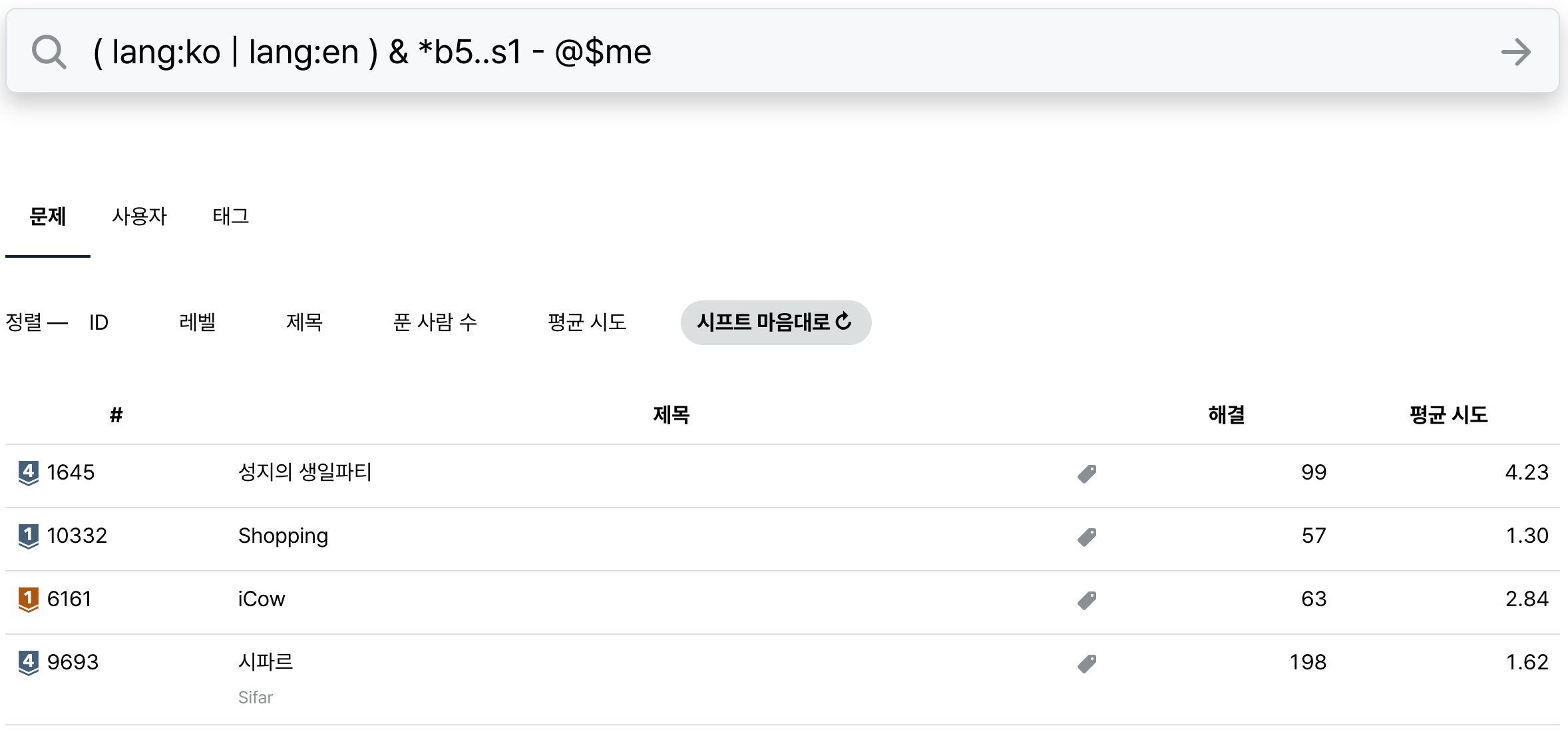 사용한 solved.ac 명령어는 ( lang:ko | lang:en ) & *b5..s1 - @$me 이며, 제가 풀지 않은 문제 중 한국어 또는 영어로 된 브론즈 또는 실버 문제를 검색하고 랜덤 4문제를 풀기로 하였습니다. 그리고 4문제 중 1문제 이상을 Python으로 풀기로 했습니다.