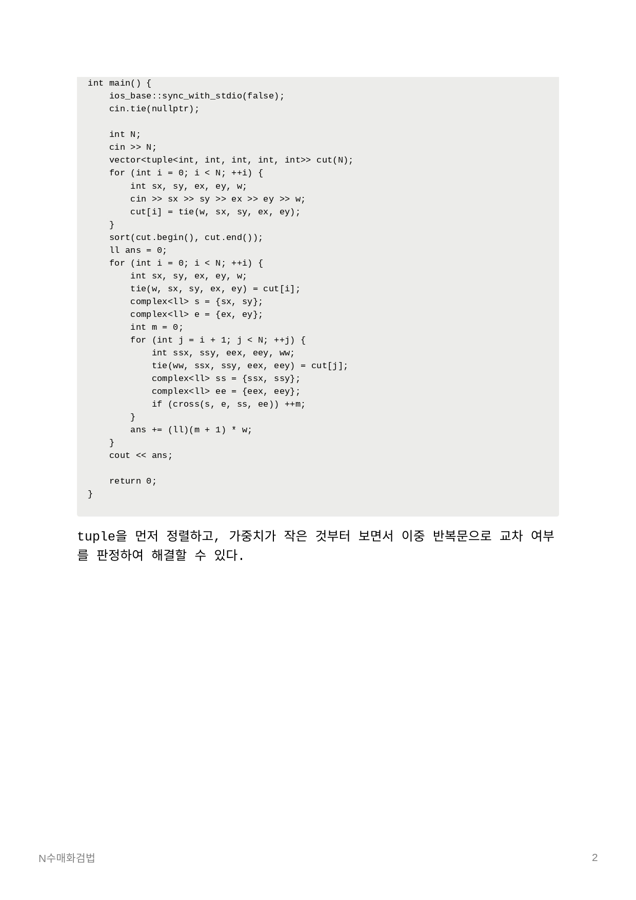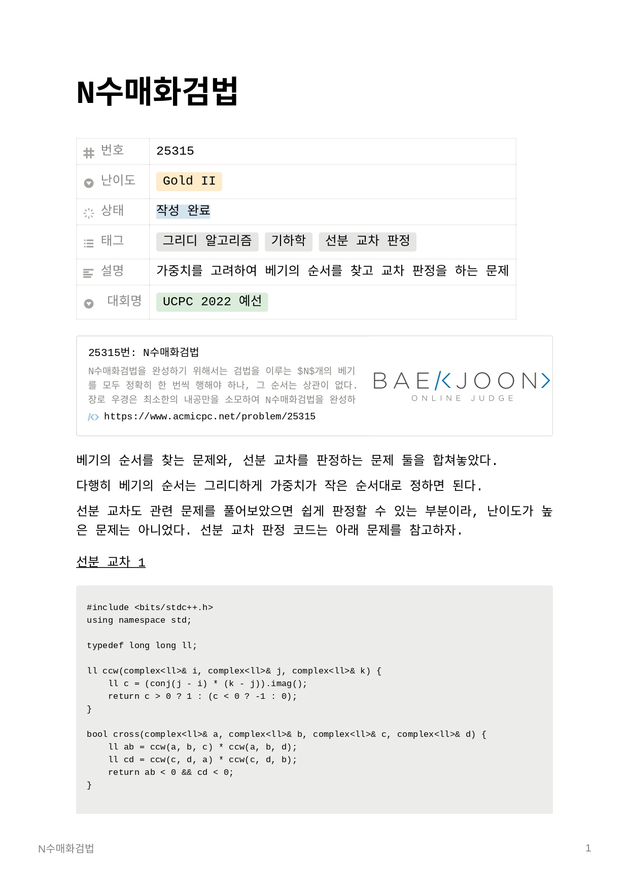 다음으로 저는 B번을 잡고, 빙하님과 캐티님은 J번을 잡았습니다. B번이 아직 공부하지 않은 선분 교차 관련 기하 문제여서 당황한 제가 캐티님에게 도움을 요청했고, 캐티님이 선분 교차 판별 함수 코드를 알려주신 덕분에 28분에 B번 솔브. J번도 같은 시간에 솔브되었습니다(페널티 +2).