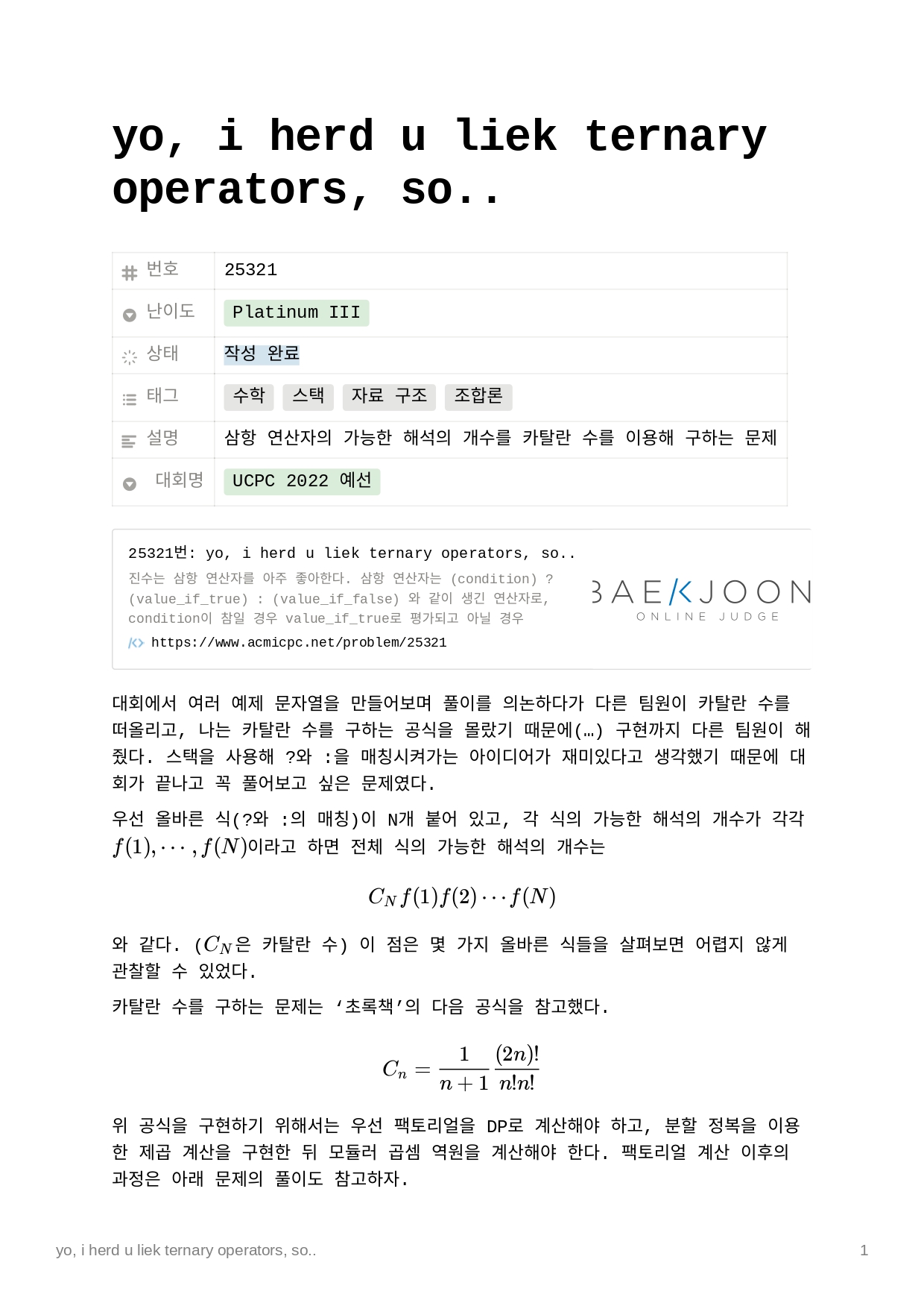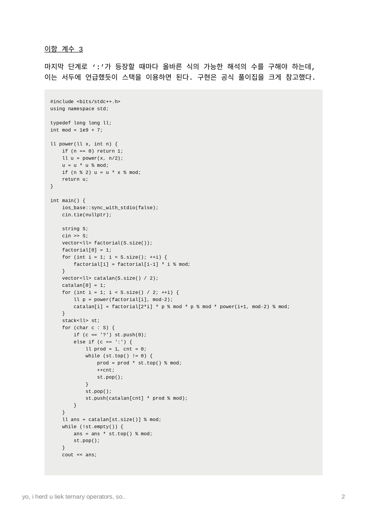 G번은 약간 더 논의한 뒤에 세그먼트 트리를 이용한 구현을 빙하님이 하기로 하고, 캐티님과 저는 H번을 관찰하기 시작했습니다. 우선 제가 삼항 연산자를 개발에 사용한 경험이 많았기 때문에(?) 간단히 문제를 설명하고 예제를 살펴보면서 ‘올바른 괄호 문자열’ 문제와 비슷한 것 같다는 의견을 냈습니다. 그러자 캐티님이 잠깐 고민한 끝에 카탈란 수를 계산하는 문제인 것 같다고 말했습니다. 그리고 곧바로 구현에 들어가서, 163분에 AC를 받습니다(페널티 +1).