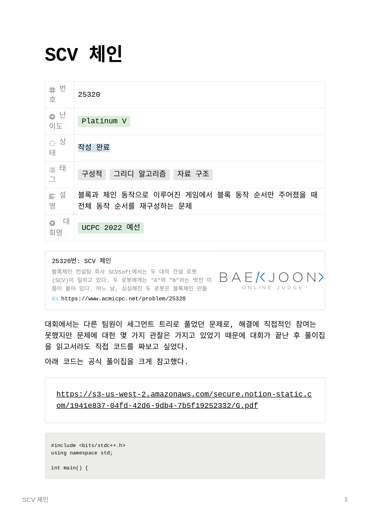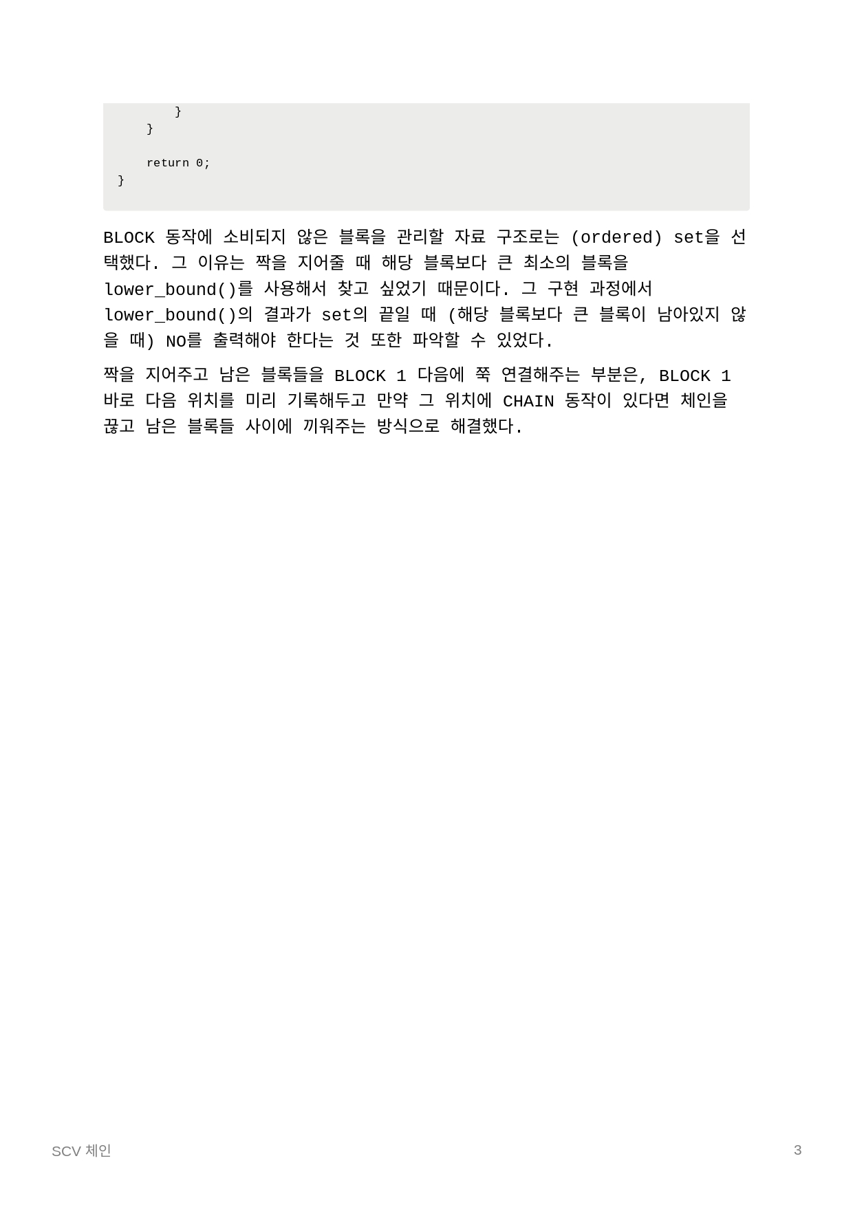 빙하님이 잡은 E번은 날짜/시간 문자열 파싱 문제여서 구현 시간이 길어졌고, 캐티님이 어려운 문제였던 D를 솔브하는 동안 저는 G번을 살펴봤습니다. 제 실력으로 혼자 풀 수 있는 문제는 아니라는 생각이 가장 먼저 들었지만, 1번 블록은 BLOCK으로 주어져야 한다는 기본적인 관찰을 하고 CHAIN을 어떻게 구성해야 할지 고민했습니다. 그 동안에 D번이 92분에 풀리고(페널티 +3), E번이 101분에 풀립니다(페널티 +3).
