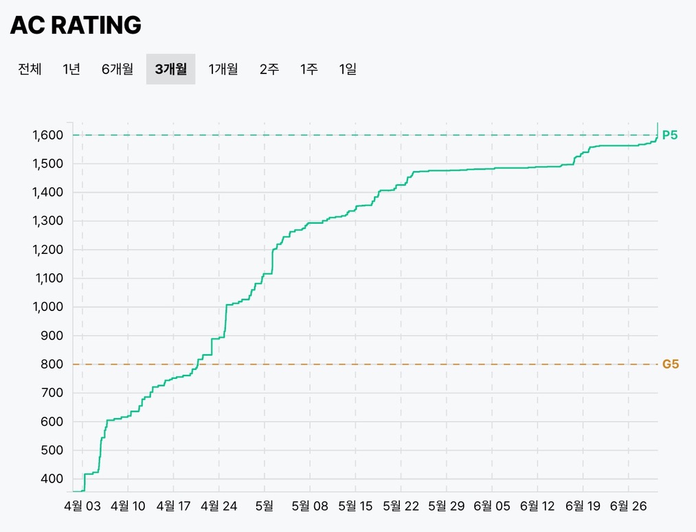 개인적으로도 준비인지 그냥 공부인지 모를 문제풀이를 꽤 한 편이고 티어를 8단계 올려 Platinum V가 되었습니다. (저에게 많은 도움을 준 초록책 그리고 solved.ac의 개발자님과 BOJ 단계별로 풀어보기 관리자님 사랑합니다)
